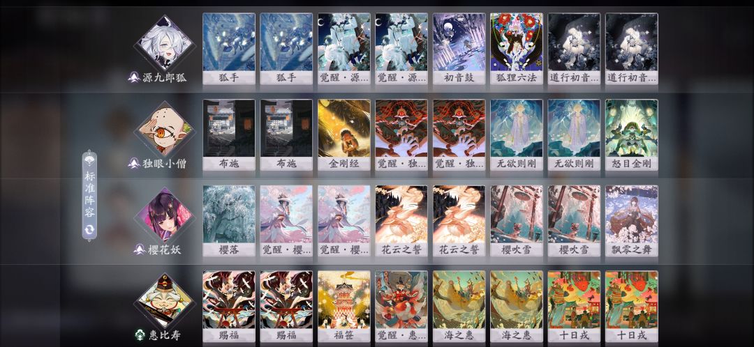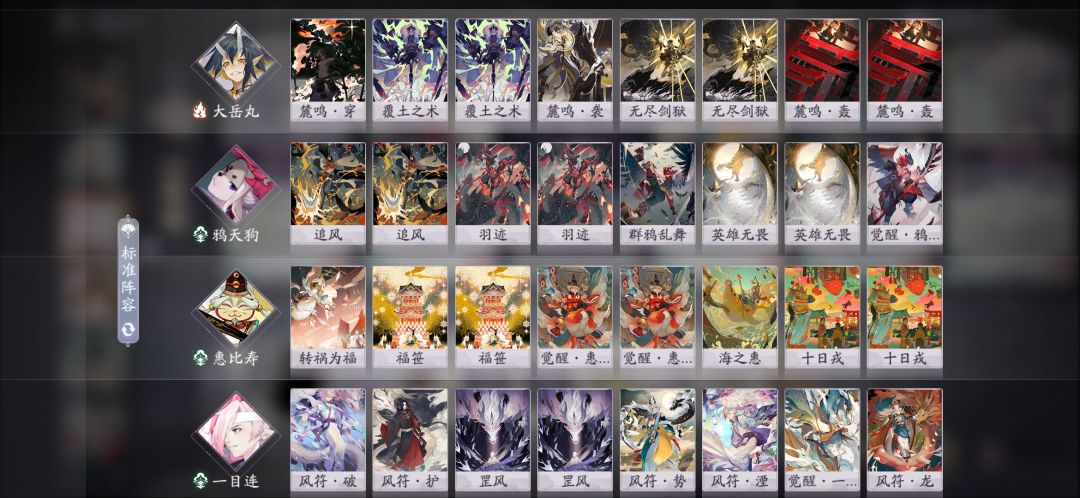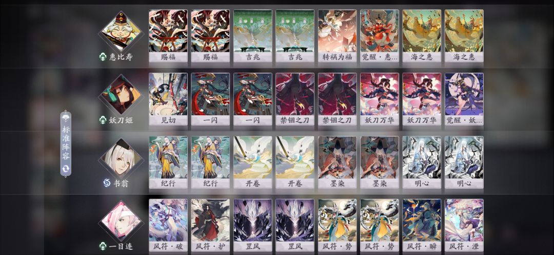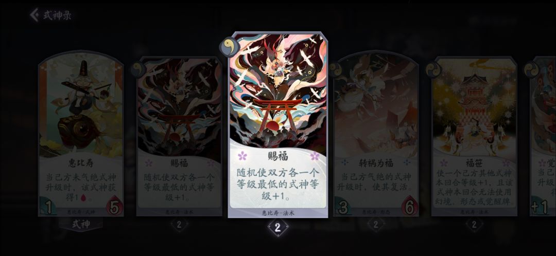 以上是关于惠比寿式神及单卡的分析,我们可以通过前面的分析可以很明确的得出惠比寿是一个与式神等级相关的后排成长型辅助式神,下面说一下我个人理解的和惠比寿契合度比较高的式神,关于惠比寿核心卡牌的构筑,以及一些可能存在的有趣的小combo。