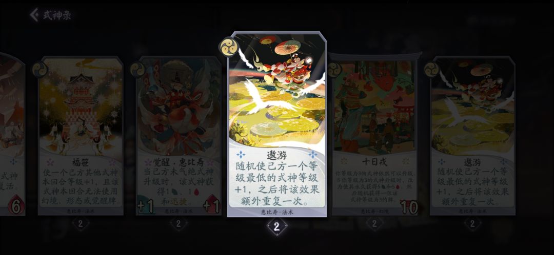 3勾R稀有度法术卡,该卡牌作为一个3勾卡牌,理论上的使用大概是这两张情况:1.惠比寿升3之后,赶紧遨游升2个3勾,下一回合挂上十日戎幻境;2.满足十日戎生效条件之后,开遨游,直接获得2个+5+5的增益效果,如果是这种情况使用,最好是再惠比寿觉醒的情况使用,不然在没灯的情况就没操作空场了。除非是这种故事:十日戎满足触发条件,小僧无欲则刚形态在场,我们直接遨游。该卡牌的存在基本上于惠比寿的十日戎绑定,且惠比寿的卡位里可能会带上觉醒和形态卡后不会有该卡牌的卡位了。