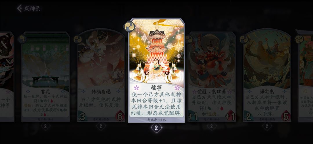2勾SR稀有度法术卡,惠比寿所有卡牌里与快攻契合度最高(只是在惠比寿的卡牌里面比,这里没说惠比寿适合快攻,只是因为惠比寿是苍叶,所以不由自主想到了快攻而已)的卡牌,同样效果作用于未气绝式神,迅捷效果有可以提高我方的攻击效率(出击不用火了,可以把鬼火用到更有价值的地方)、场面交换能力,并且配合满足条件情况下的十日戎时,可以可一个式神进行培养,输出。福笹使用后会触发惠比寿特质,下一回合式神回到原有等级后再升级还可以触发惠比寿的特质。