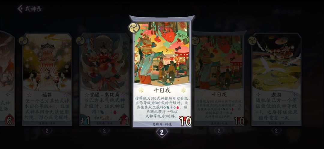 这里加一个知识点:在十日戎幻境存在且满足使用条件时,使用福笹可以使被作用的式神获得身材成长,但是如果用百闻一得则只能抽一张卡牌。如果在全员3勾之前,福笹和百闻一得都可以触发惠比寿特质(含觉醒效果)或者形态卡的效果。