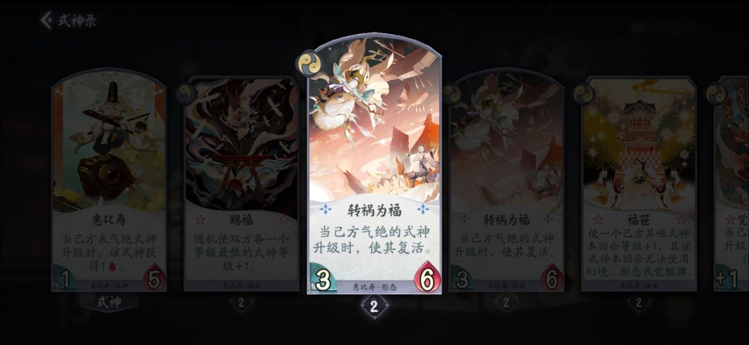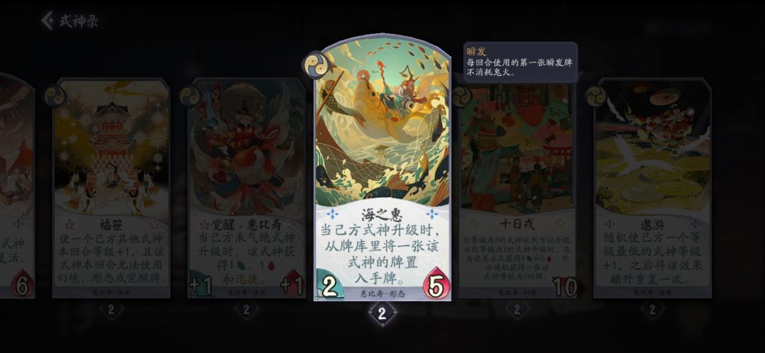2勾R稀有度形态卡,升级气绝式神时可以将其复活,在结附该形态升级气绝式神时,优先触发惠比寿的特质加血(但是由于该式神气绝,不触发),之后再将其复活。该卡牌的效果很好,可以中期的时候用低勾式神进行场面交换后将其复活,同时也可以在使用十日戎幻境(且满足幻境触发条件)的情况下,稳定保证输出式神存活且可以进行输出,效果甩觉醒犬神八条街。
