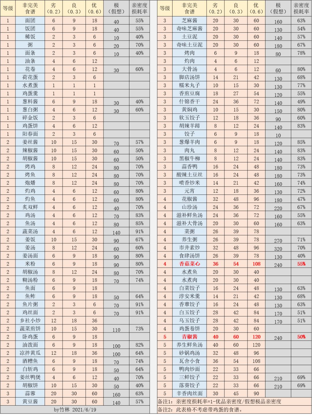 附上单个食材的亲密度:(2021/7/3更新6级食材和鸡蛋亲密度)