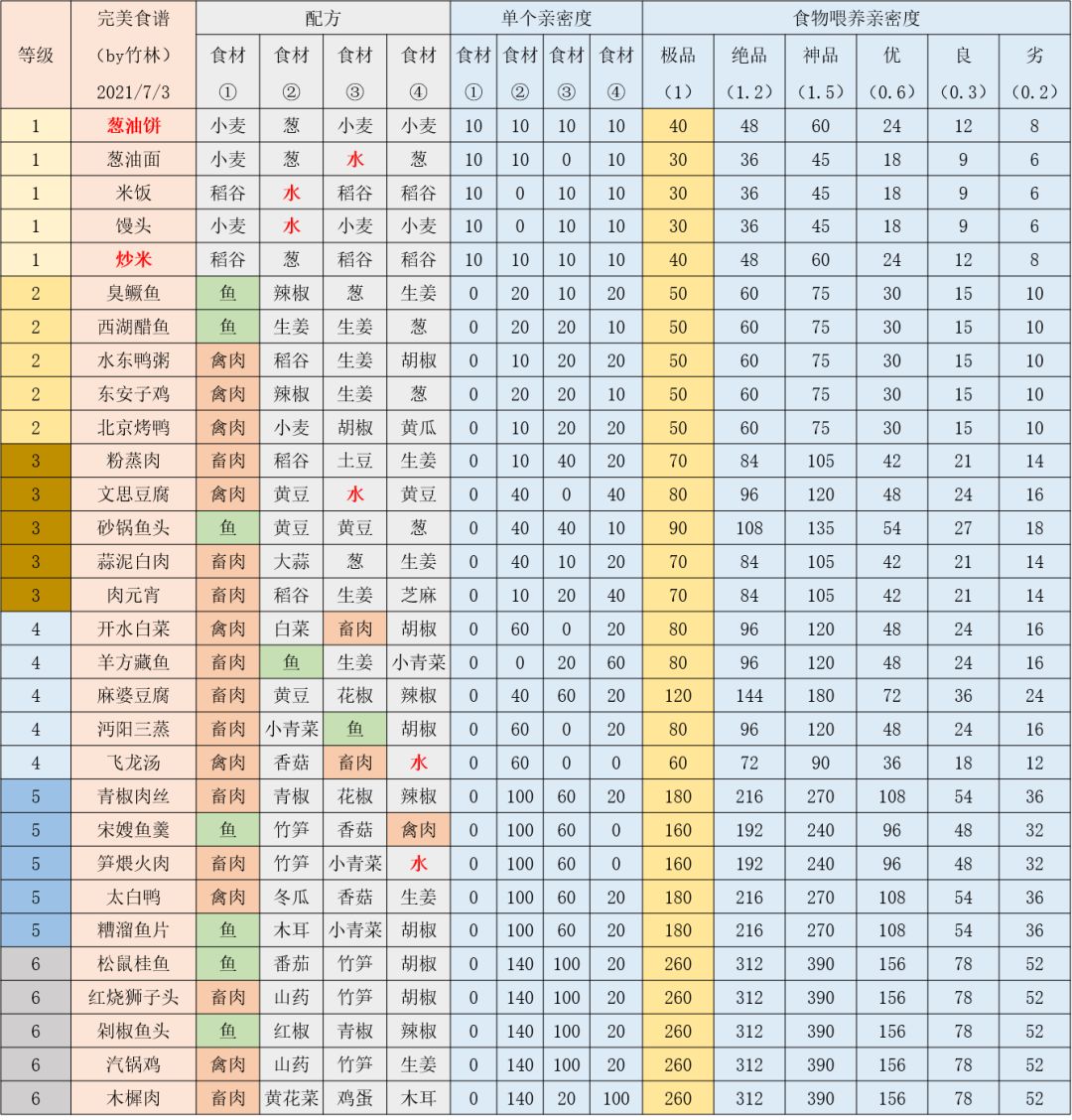 (表格一:完美食谱,2021/7/3更新6级食物)