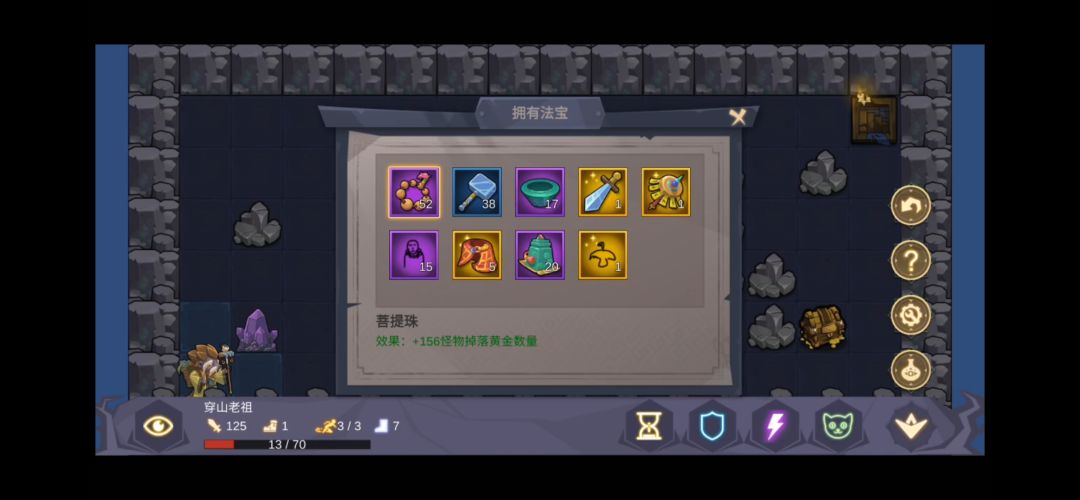 前期堆佛珠,适量出锤子,自带40%反击率纯佛珠裸奔前十层轻而易举。十层墓碑选行动点恢复,2/2行动,11-20的怪都是1行动,走A乱杀。19层买够圆满,20墓碑点攻击等级。20之后出锤子,游龙盆,可以再堆点佛珠。30墓碑点行动上限,30之后锤子,游龙,法华,金钹,游龙先买到10个以上,基本一两次反击就清屏了。40墓碑点攻击等级,5.1倍反击伤害。到最后反击率到100%,攻击力堆到120以上,金钹随意,越多越好。50墓碑行动点恢复。这时候每次反击伤害最低为120*3*1.7=612,而有金钹波动,实际伤害只高不低。