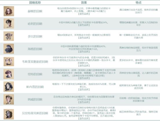 不同回响之间的特性差异也是较大的,目前游戏中一共有九种回响,大家可以在下表中看看到底哪一个更适合自己的风格吧。