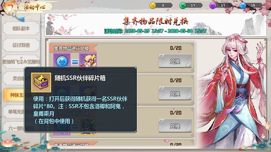 【SSR随机伙伴碎片箱】(可随机得到一名SSR伙伴碎片80枚,不包括洛卿、阿鬼和皇甫乘月)、【伙伴皮肤任选包】、【S\SR随机伙伴碎片箱】、【SR~SSR伙伴碎片】。