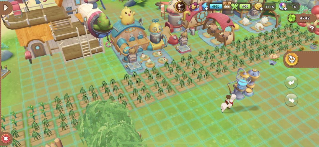 2、家园布局:土地,动物舍,家都放在旁边,家放在最近的地方方便好友互花,然后收割机一直到头,水放中间方便接水,三个动物舍在地旁边方便收获喂食,饲料机在对面。
