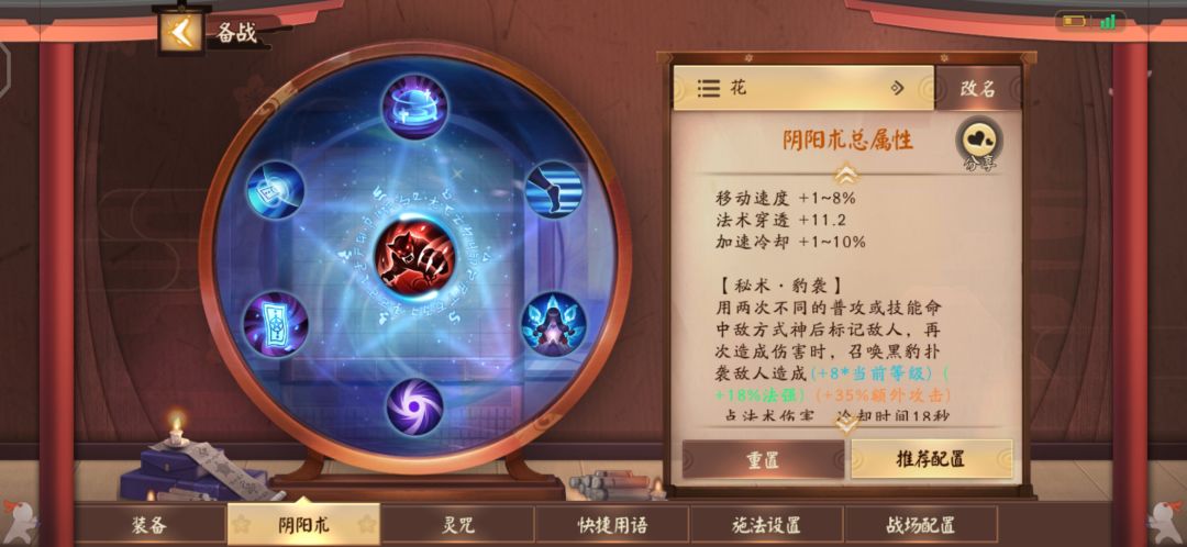 当大招的图标亮起后,便是"花魂"叠满的时候。注意,大招的释放会有一个很短暂的延迟,在追击敌人时,敌人在你大招边缘,那么当你放大招时,敌人是可以走出你技能范围的,也就是我们常说的空大。所以,尽可能的将敌人套在技能中央。 接下来是装备和阴阳术推荐,装备的话我个人推荐这个出装顺序,也是大神出装上的