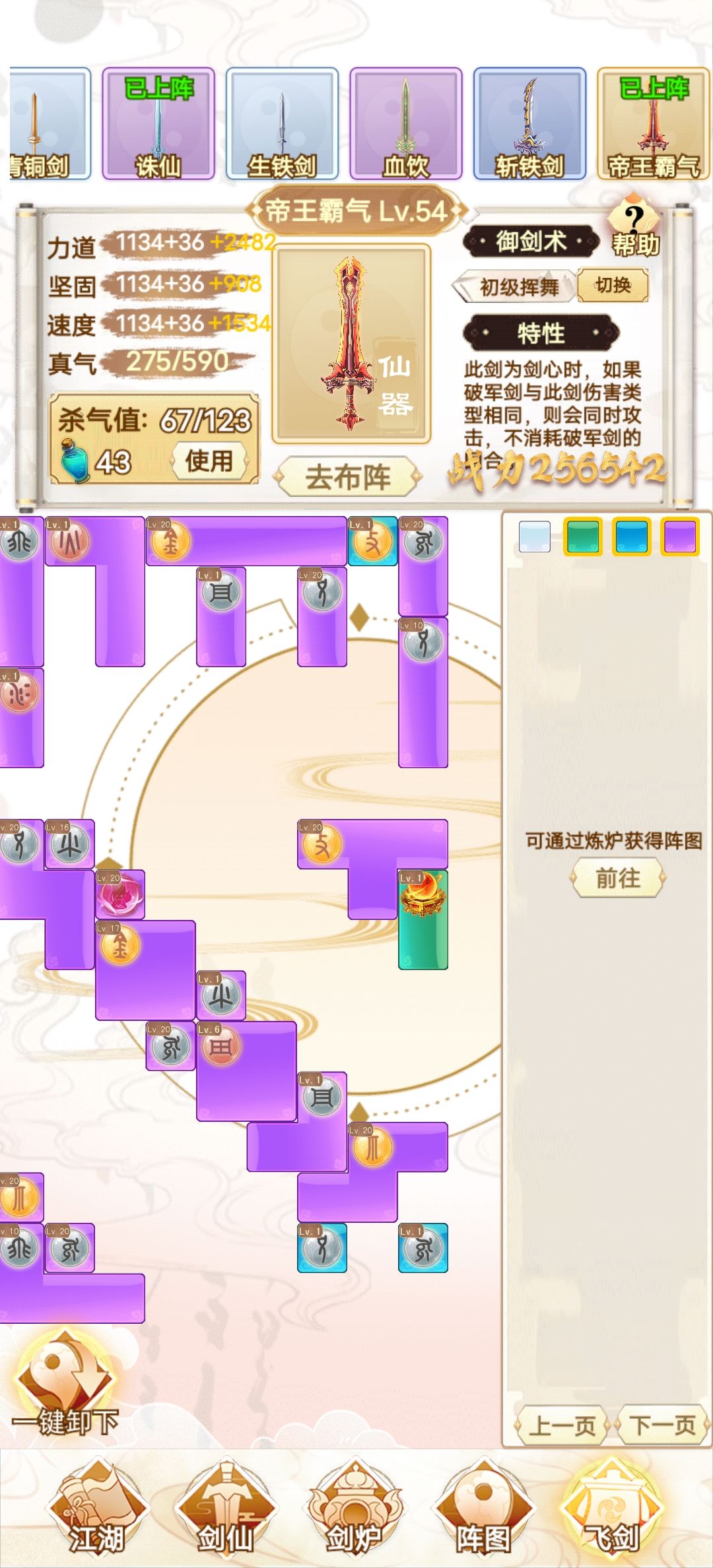咸鱼 断断续续玩了十多个小时 现在已经通关了 还是很简单的 前期就靠一把剑一直推图 所有的阵法全放上就完了 中期就慢慢换 我基本上都没叠过速度 直接力道拉满 中间卡了一下关 强化一下阵图就能过了 难度不高 只是感觉最后两把灵剑合成有点过于麻烦 中间看攻略还以为合成公式有问题 结果炸了一遍 那时候心态有点小崩 不过还好 几分钟后又弄了一遍 就合成出来了 后边就靠两把剑 把阵图一强化 基本上就很容易打通了