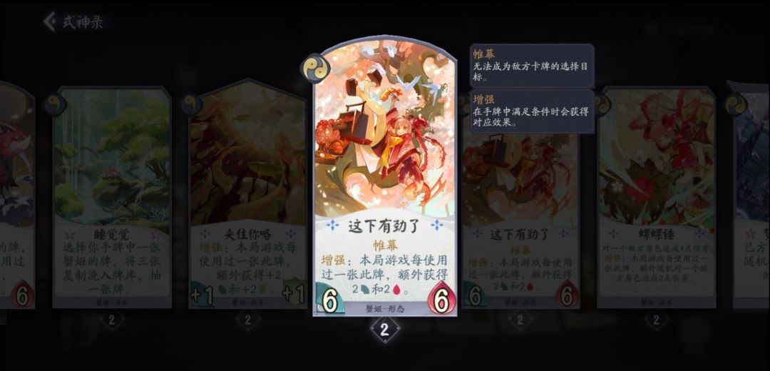 二勾6-6帷幕,加强多了个帷幕吃一次加成是8-8并且带瞬发。如果版本后场式神不厉害,那么这张卡可以把二勾螺螺锤卡位挤掉,如果后场厉害或者你的卡组没解后,那么还是螺螺锤更好,帷幕表示对方只能硬碰硬解,这张卡最大也是唯一的缺点就是后期和救救我对顶,而且没配合,并且蟹姬个人觉得不吃身材。