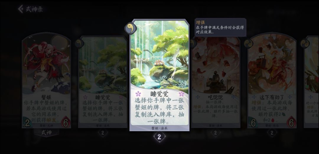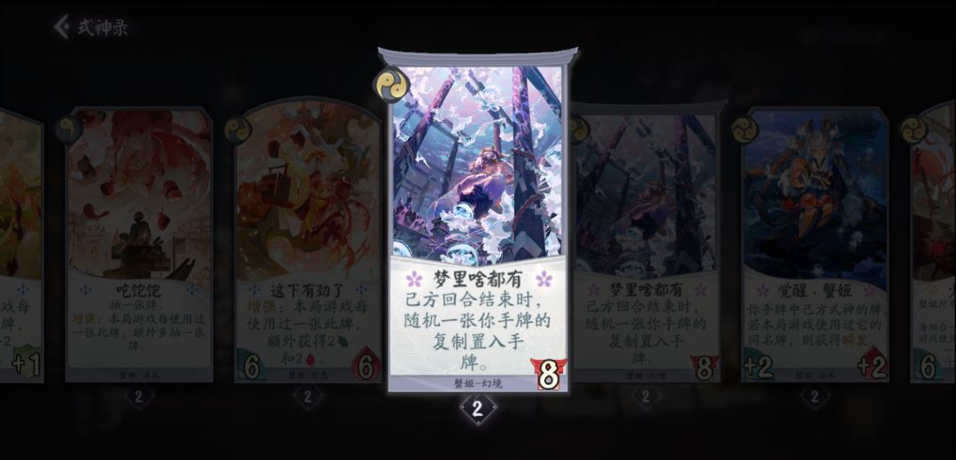 己方回合结束,意味着稳定给一张,手牌的复制包括其他式神的牌,除了给觉醒和形态以外的牌都不亏。战斗牌,法术牌都是场面资源,给蟹姬自己的牌,那就是直接两张手上稳定触发加强效果,我觉得这个幻境很好用。