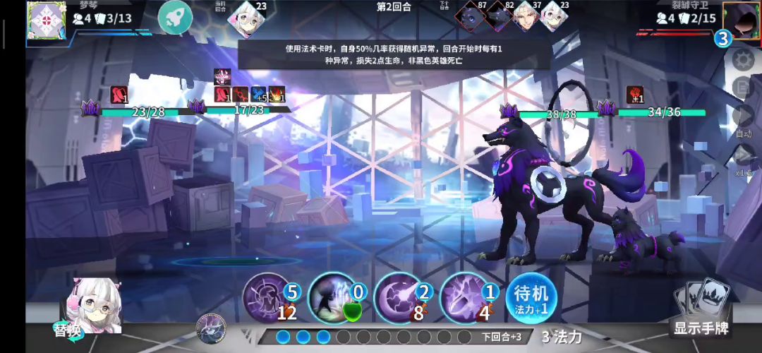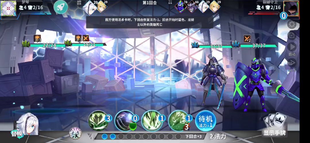 因为蓝这里,每用一张卡,下回合恢复法力-1,这里就要学着存牌啦,下面上操作