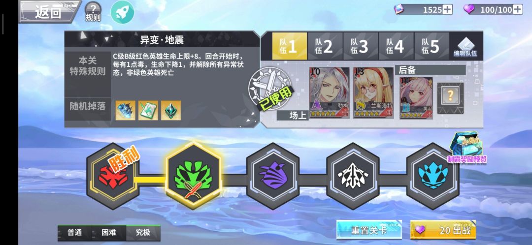 究极红可以说是活动最简单的一关了,开局兰斯2技能砍,因为对面第一回合会攒狂怒状态,所以兰斯不要跳走。第二回合兰斯跳走换美羽,之后美羽跳回来一直这样跳就好啦,勒梅一直放大,防御号令出来就用,反击给兰斯上上,轻轻松松就过啦