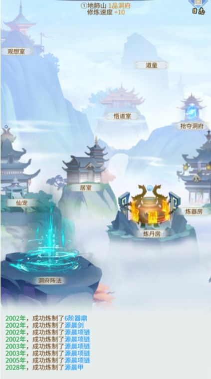 洞府主要有观想,悟道,道童,抢夺洞府,炼丹,炼器,阵法,居室,仙宠。