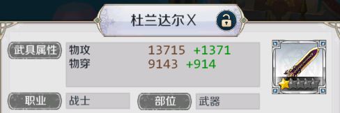 四个武具部位中,武器上所附带的穿透最多,一般情况下我们都是选择穿透武器来给英雄装备。进入游戏中期以后,就可以用赤玉来提升武具品质了,输出手优先提升武器部位来提升穿透。以物理战士为例就是选择杜兰达尔了。
