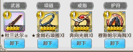 如图所示英雄身上武具共有四个部位,从左到右分别是武器、项链、戒指和护符。