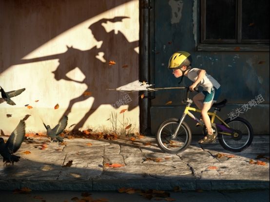 (趣味插画:骑单车的小男孩的影子,像一位骑士一样)