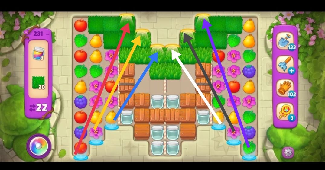 如上图所示,每种颜色的箭头代表着元素会从相对应的传送门掉落下来。这一点很重要一定要弄清楚,只有配合好各元素从各传送门掉落的顺序,才能更好的帮助你消除障碍物、收集关卡目标。