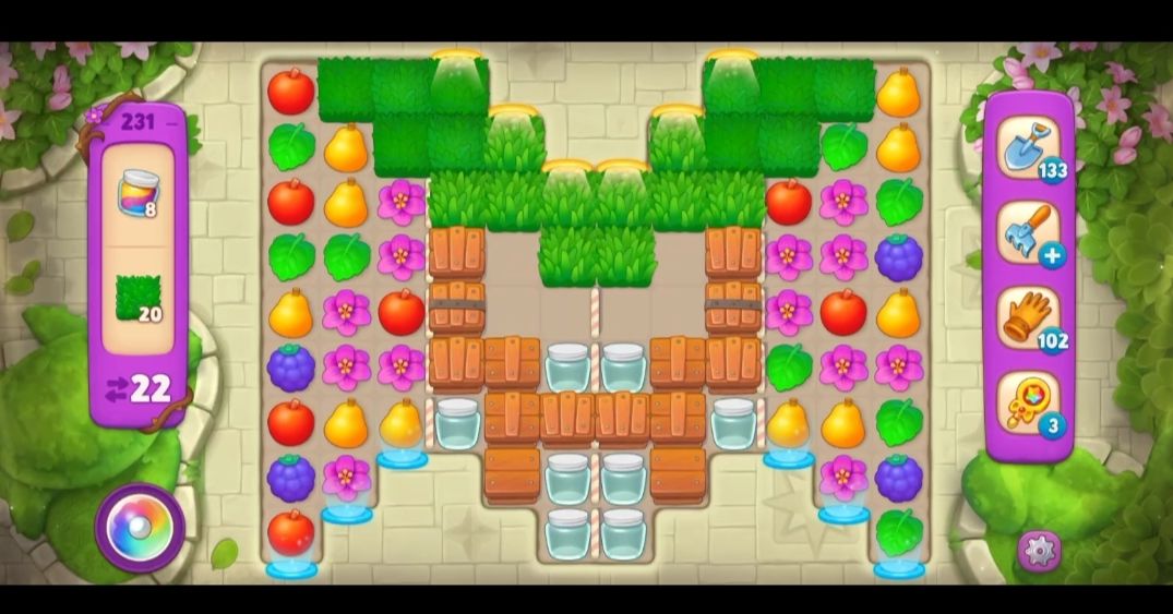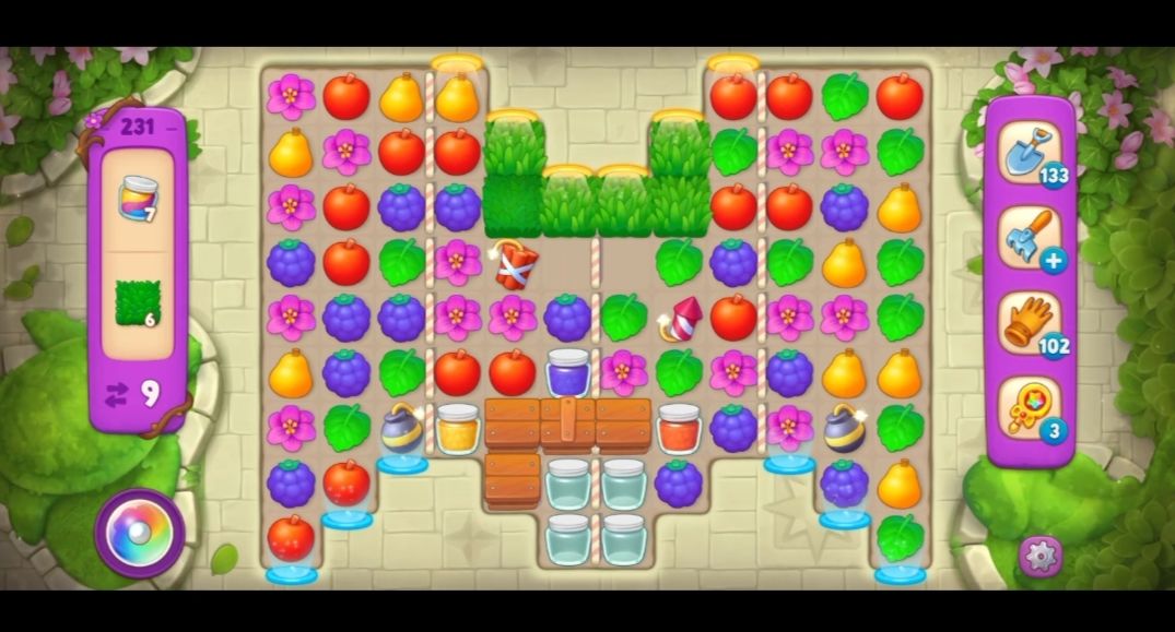 首先第一步就要对上方的草丛进行消除,只有打开一个口子才能让元素填满空缺的位置,才能和墙壁外的元素相互结合,里应外合,才能顺利消除箱子,给空瓶子染色。