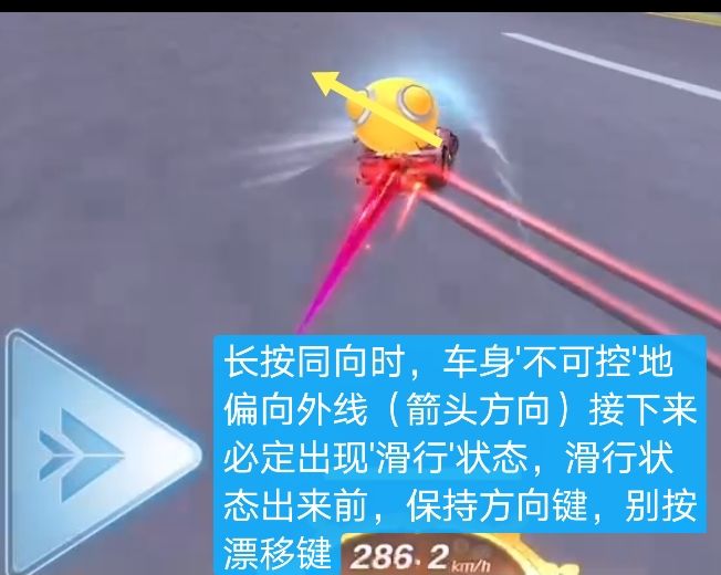 情况二:长按''3''时,车身不可控地往外漂(图一),接下来必定出现滑行状态,这时,就可以按照教程所说,保持方向键,直至车体脱离滑行状态,再轻点漂移键,达成爆冲