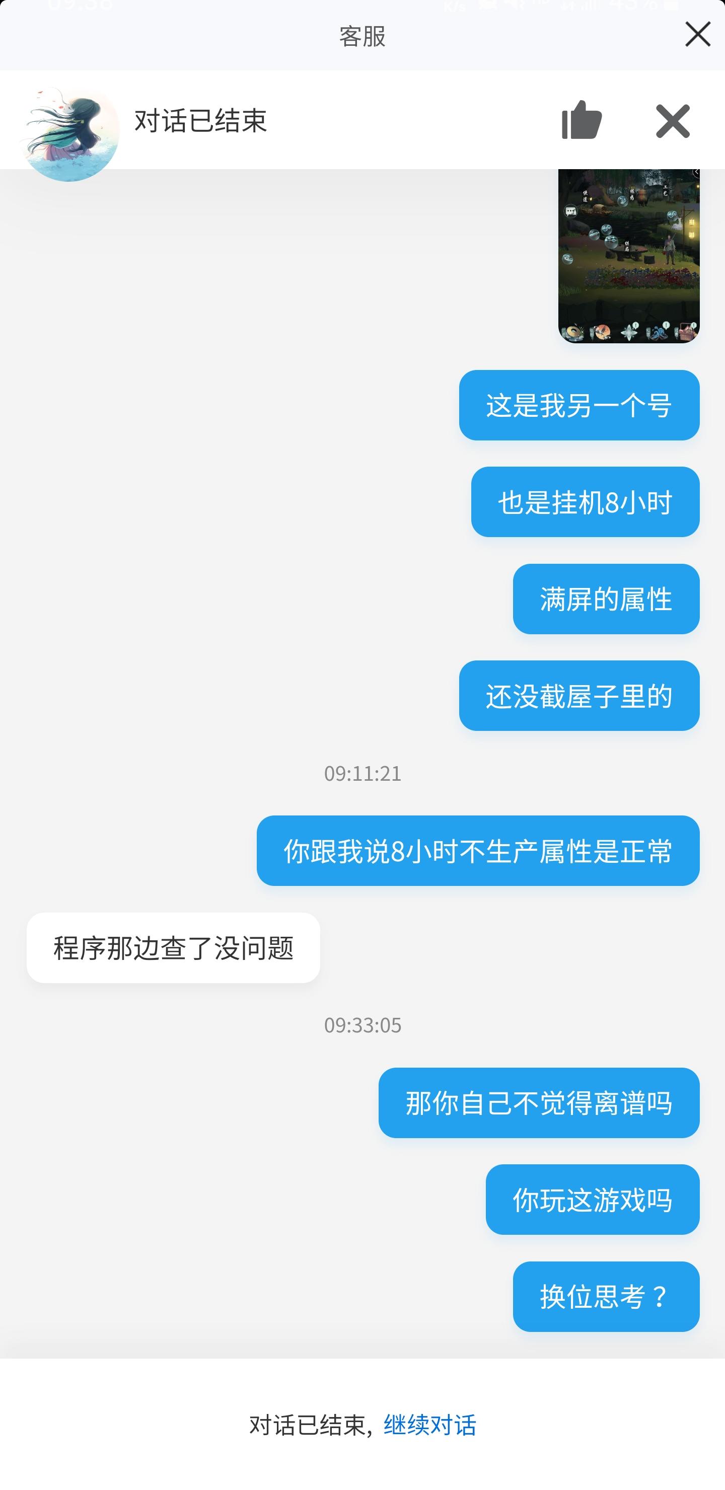 两个号都是12点下线挂机,早上9点打开游戏发现小号一个属性球都没刷出来,客服告诉我是正常的,打开了大号发现满屏都是属性,从7号开始玩的第一次这样,是零氪才会被客服直接结束会话吗???