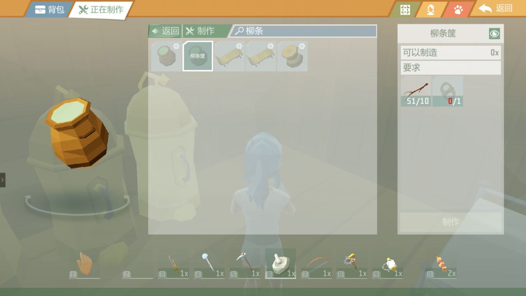 制作一个柳条筐需要准备木棍x10(竹棍x5)+任意绳子x1。