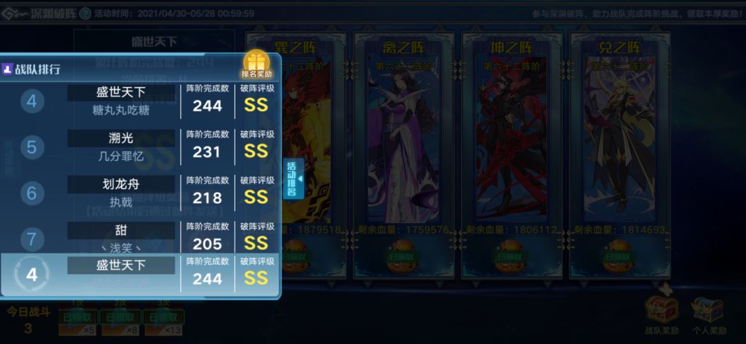 队内成员多次蝉联神宠榜1,矿洞榜1,上赛季的竞技场榜1也在队内(这赛季目前是第二😢),上届战队赛未组织第4,每个月都开地下城(特殊情况不开或者节假日连开多次)