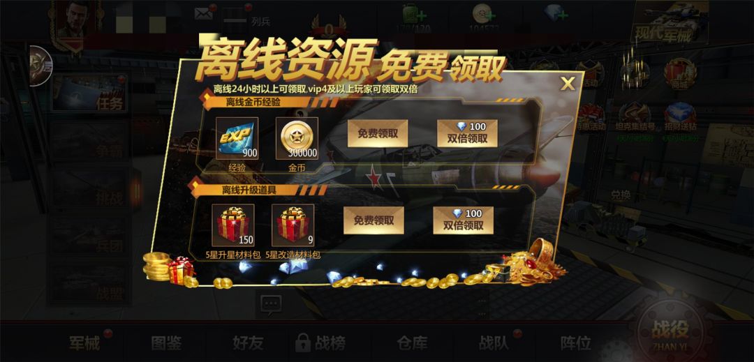 离线24小时以上可以领取vip4。离线金币经验:经验x900,金币300000。