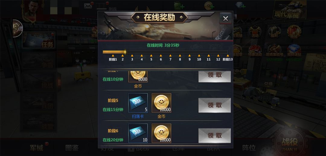 在线20分钟:扫荡卡x10,金币10000。