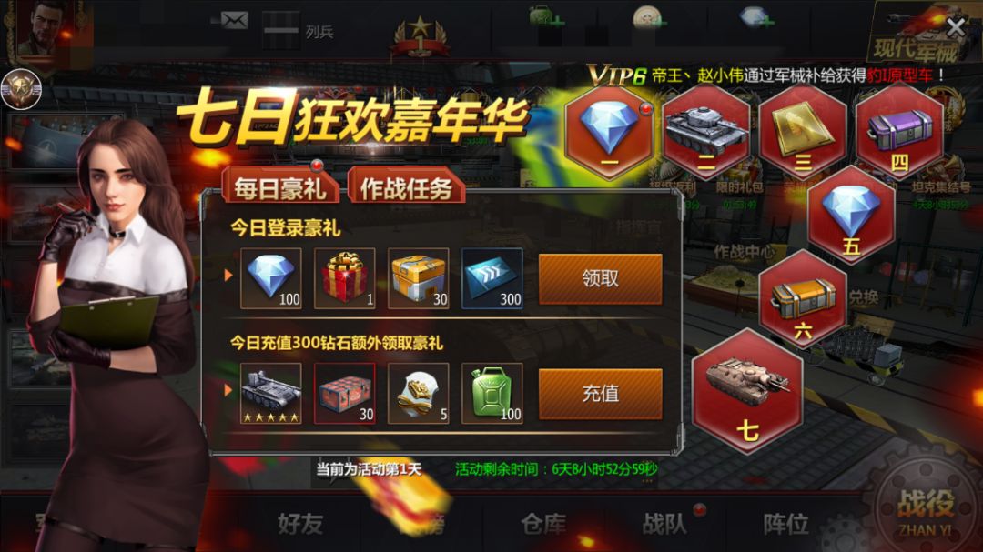 第六天:5星车组礼包x1,三星伦道夫车组全套x1,大号金币包x5,扫荡卡x100。