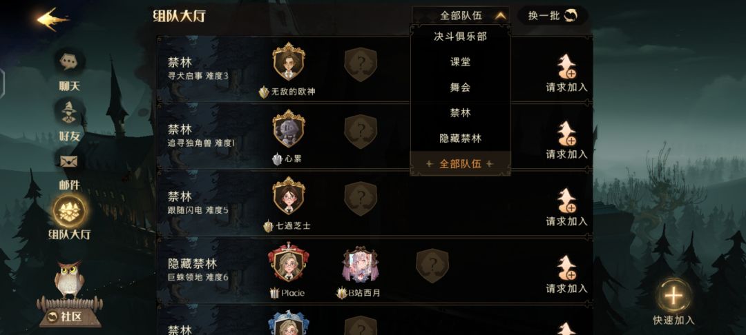 ○通过点击社交框→组队大厅可快速寻找对应项目的组队