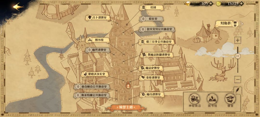 地图分为三个主场景,城堡上空,城堡主楼,对角巷。虽说可以走走看看但地图其实小的不行,除了可能会遇到一些小奖励和NPC对话外,没啥好探索的,也探索不出什么新功能、玩法