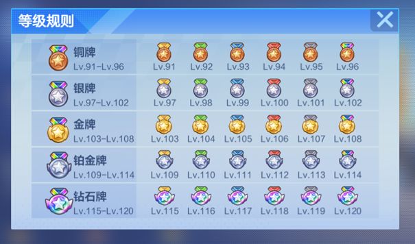 新版本中,等级上限将扩展至120级。新增两个等级段,分别是铂金牌和钻石牌,每个段位均有6个等级:黄带铂金牌、绿带铂金牌、蓝带铂金牌、红带铂金牌、黑带铂金牌、彩带铂金牌;黄带钻石牌、绿带钻石牌、蓝带钻石牌、红带钻石牌、黑带钻石牌、彩带钻石牌。