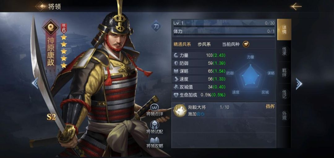 神原康政整体属性都处于中游水平,力量与速度相比其他6统将领较突出,但与7统核心武将相比就比较弱了,更倾向于阿提拉那种辅武的使用方式,为主将提供加成的同时补充一定量的伤害。同时神原康政因为自带技能的效果,比大多数将领都更“脆”,更适合菜刀队速攻打法。