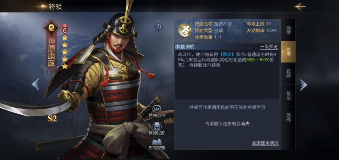 神原康政的传承技能比较极端,放弃了发动率追求伤害,而类似的群攻状态有许多,但坚持不懈是唯一一个持续全场,且伤害率高达160%的被动技能。不过该技能的发动率并不高,若是不具备连击,反而不如常规追击技能强力,更适合给具备连击能力的将领使用,或是搭配连击使用。