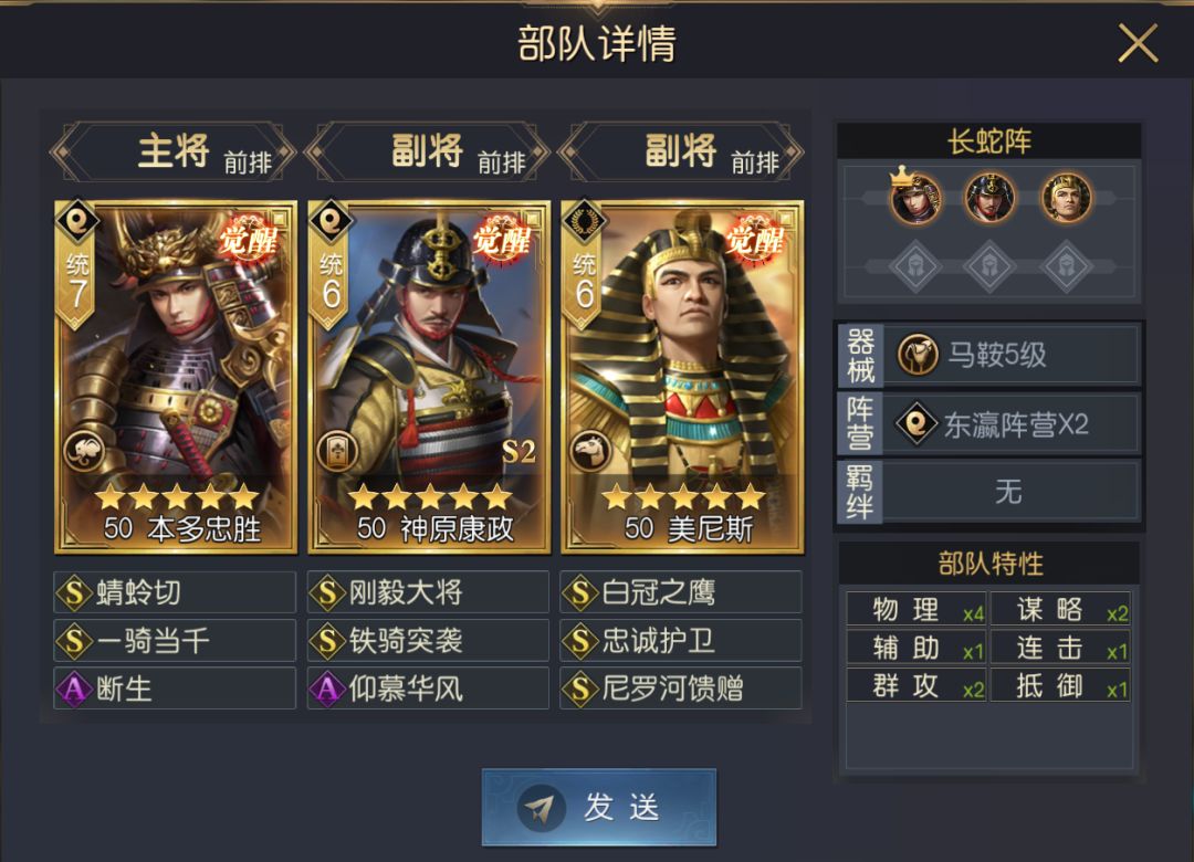 考虑神原康政的属性并不突出,在持续流血的情况下兵力也无法得到保障,所以建议大家将其作为辅助更好,由于会心状态适应能力较强,无论是菜刀追击还是菜刀主动都能和他完美契合。特别是一些主打爆发的将领,如黑胡子、赫克托尔这类将领会更适合他,