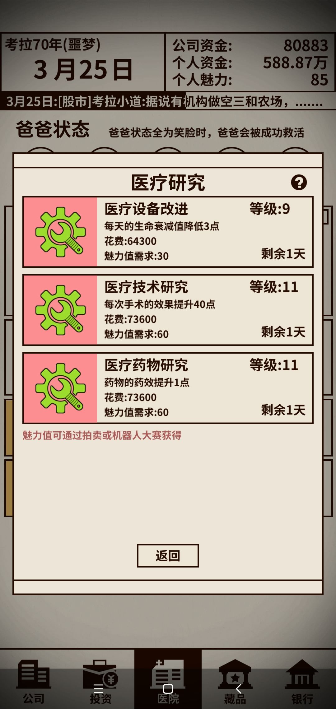 4.医疗研究:如图我是平均点的,但理论上不对。理论上药物可以少点,点到药效正常就行。设备也不用点到每天1血,每天多掉点血也无所谓,因为每天都会收设备费用,点高了设备费也高,不如少点几级掉点血做手术补回来,升级的钱用来买股票开公司。