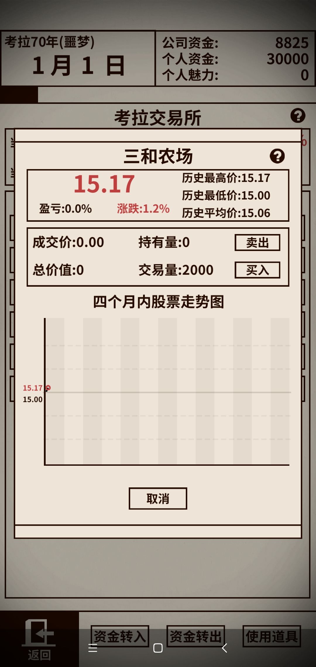 第6-31天:食品店升满鸡蛋三明治,服装店升满长裤。等钱攒到5w开始买股票,只买短期,每天开始看到红色的1%以上就买,基本上一天能赚5%。预计26-30天左右能开电器公司。