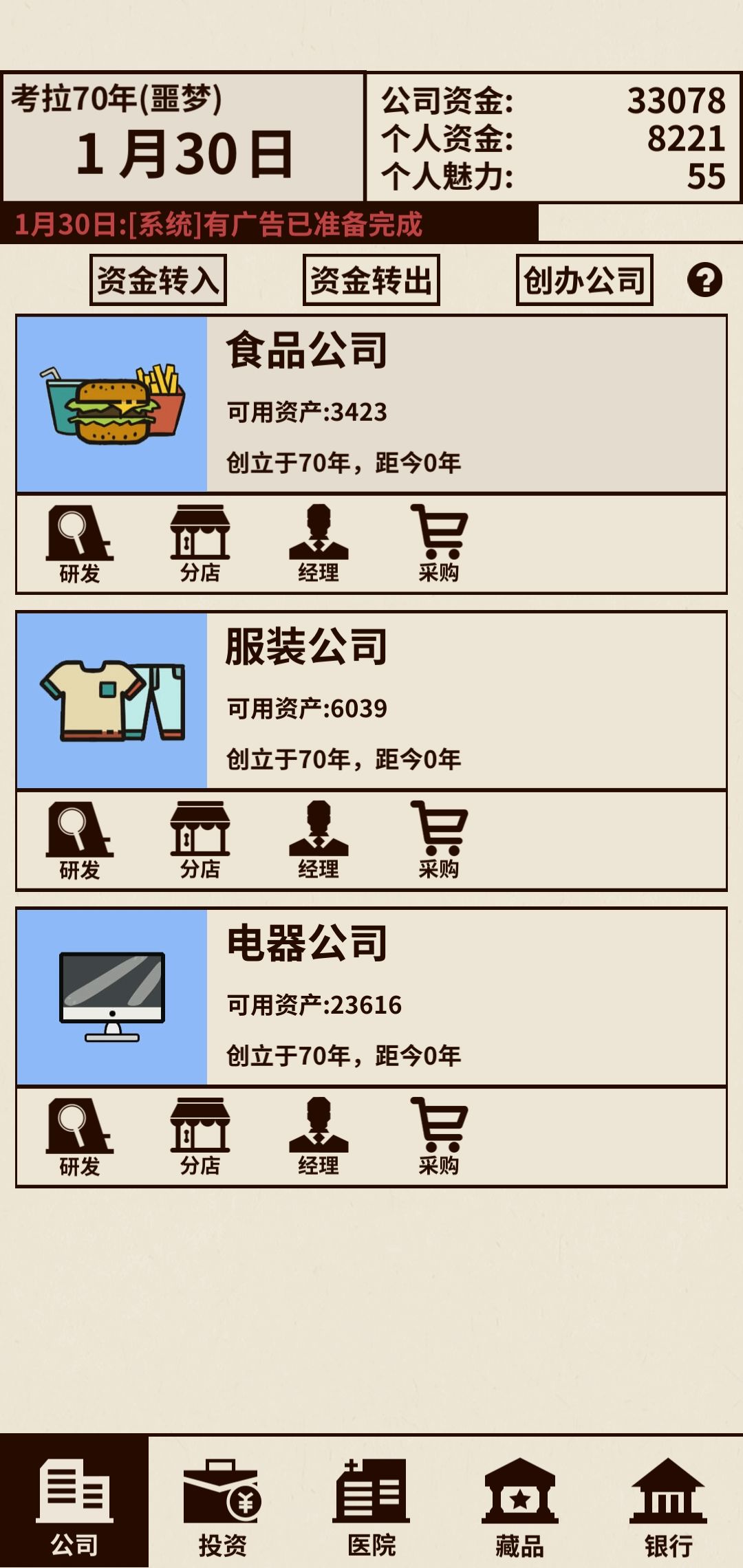 1.分店:前期别去管,即使是最便宜的2人的也要一天7000块。在生产线没开满前,可能2人就能加100个日产销。前两个公司在生产线升满后,或者公司产品能赚70以上时就可以选2人的分店。