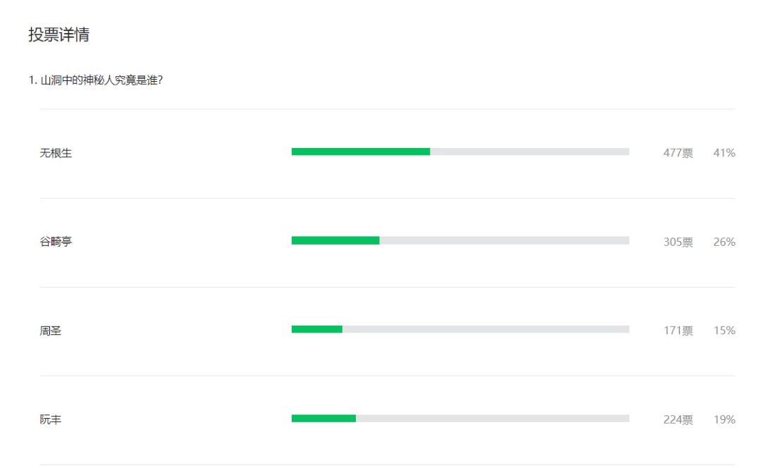 上周给出的问题是,让大家猜测一下山洞中神秘人的身份,熊猫菌也是绞尽脑汁的想出了四个有可能的人。从大家的选择情况来看,大部分的小伙伴还是比较倾向于无根生和谷畸亭,但是从“大罗洞观”的角度来考虑的话,熊猫菌认为可能无根生和周圣的可能性要更大一些。重点说说可能是周圣的理由,正是因为谷畸亭和周圣一直有联系,所以他才会帮助周圣去考验王也,因为王也刚好是风后奇门的传人。当然,这只是熊猫菌的猜测。