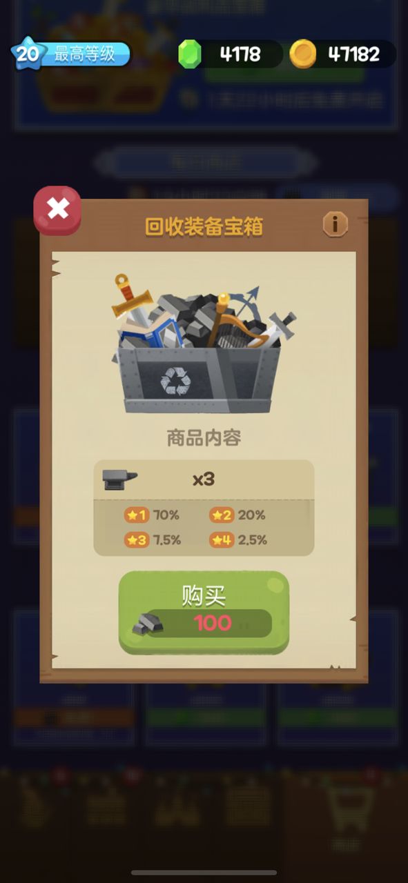 3、回收装备宝箱,这是用100个铁矿兑换的宝箱,里面装备的品质也可以不过也是随机的。很多人不知道无尽模式的铁矿是干嘛的,其实就在这里啦~