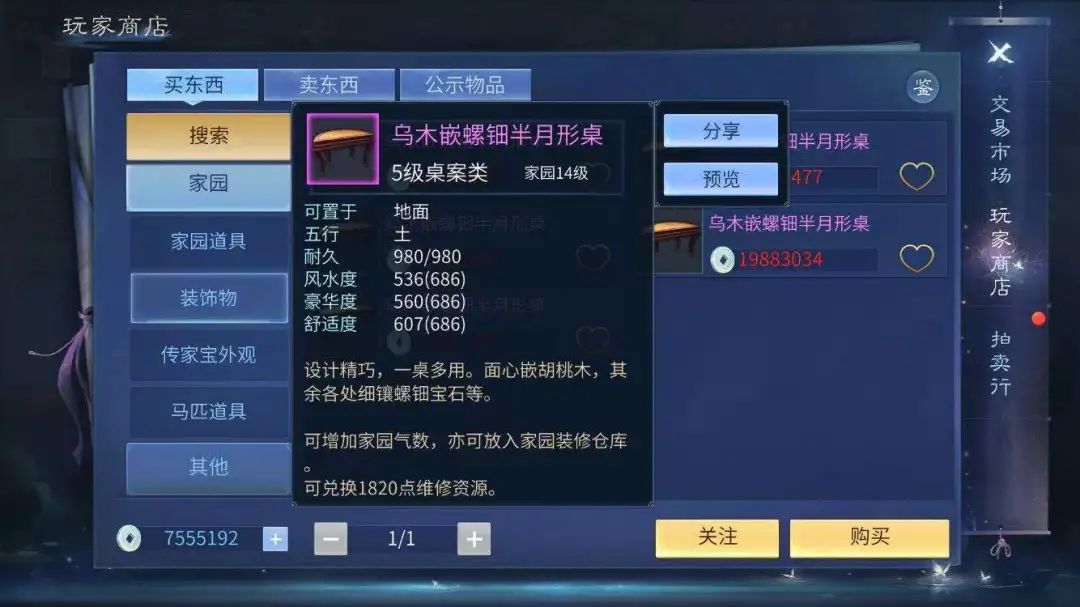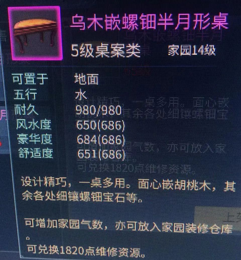 其次还要结合自己家园的属性,比如你家园是水,你带的是金,系统给你气数只有百分之百而对应自己属性的就是百分之一百二十多加百分之二十是很恐怖的,所以家具是否值钱,服务器内的供求情况也十分重要。