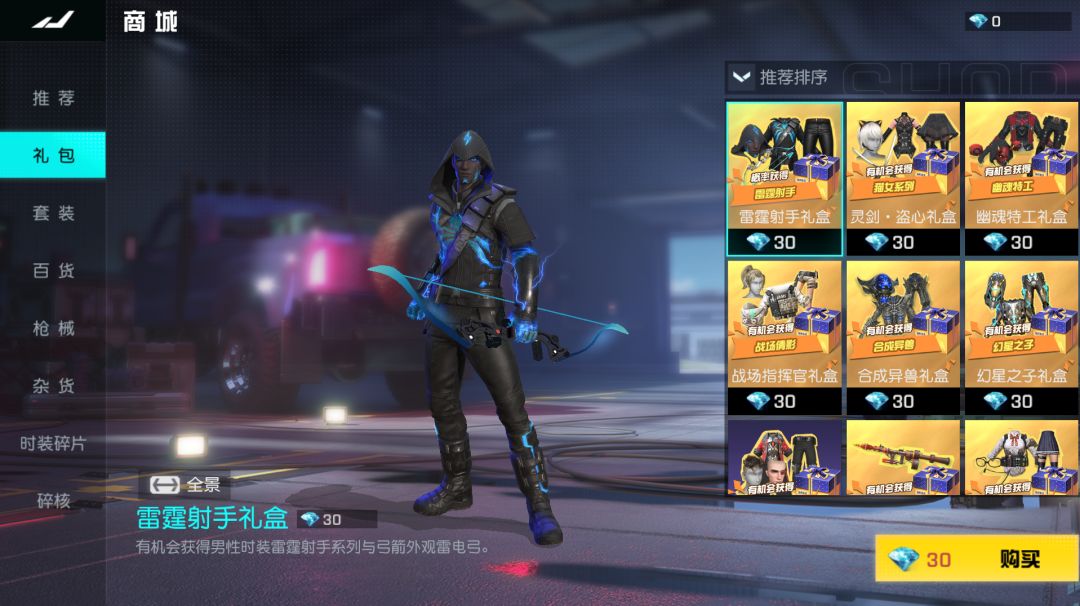 消耗钻石购买,概率获得男性时装雷霆射手系列,弓箭外观-雷电弓等外观。