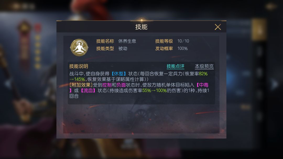 韩世忠的自带技能为休养生息,该技能会使他在战斗中全程拥有休整状态,每回合行动时都能恢复大量兵力,同时当他受到控制、负面影响时,会对敌方反制1个负面状态。该技能的重点在于稳定持续的自我续航,一定程度上减少了队伍对治疗的要求,对一些负面技能虽然无法规避,但反制后也能补充一定伤害。
