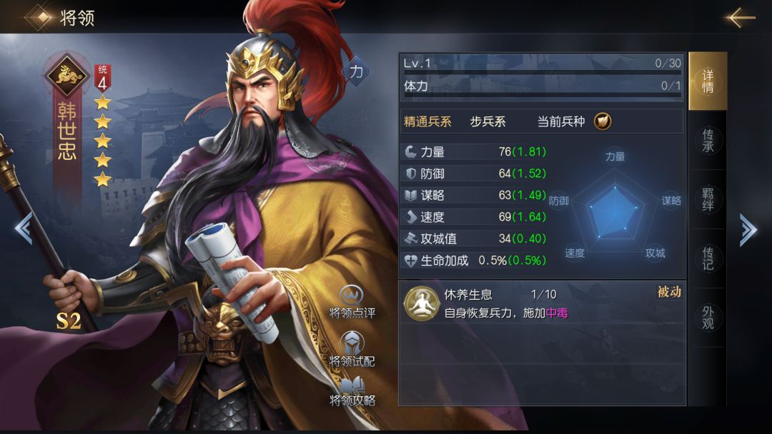 正如将领分析中所言,韩世忠的属性并不突出,技能的续航也只能保证自己的兵力健康,在后期战斗中更注重核心将领的兵力,所以他的最佳使用方式,应当是开荒期。