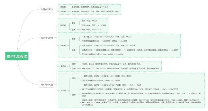 首先说我理解中的旧机制,X<50,1张泪约;51<X<100,2张泪约;X>100,3张泪约。换生日SSR要128张,换别的SSR要188张。生日池只出1个SSR,双UP是两个SSR之间随机。周年庆是新机制池,
