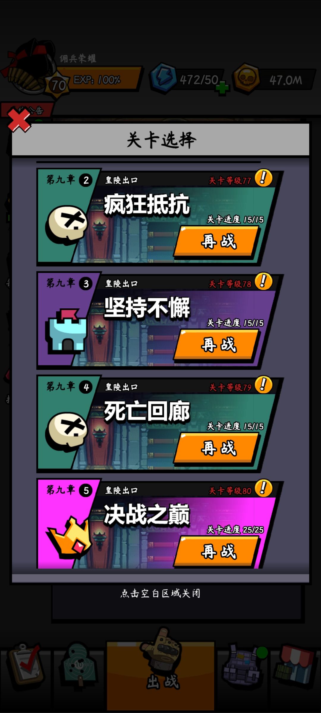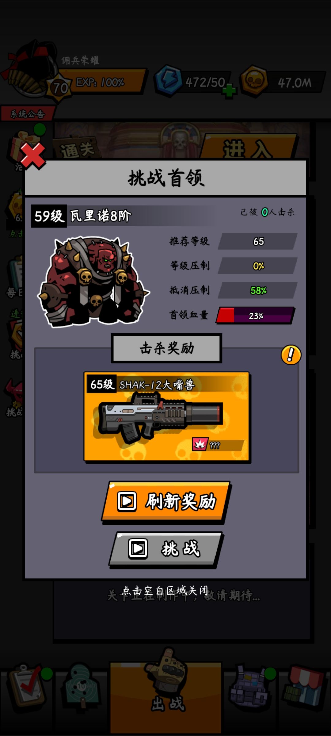 已打通,武器是双暴击双爆伤的词条,防具也都是双闪避的,还富裕小两千的红色材料。70级训练营打满,抵消58%了。这几天我至少看了300个以上的广告,以至于现在看广告都没感觉了。游戏还不错,莫名有种上瘾的感觉。要是能够再增添一些新颖的关卡和敌人就好了,从头到尾都是一样的玩起来多少有点腻歪。