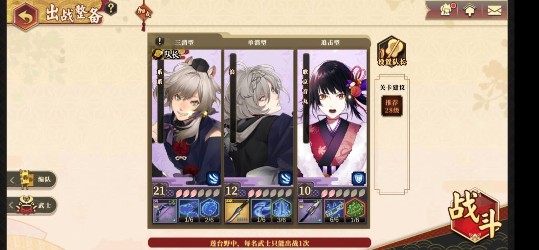30级四花芭蕉配合攻击弓输出主力,加个奶(昨天是用的三花天海)再加个萌夏配合。