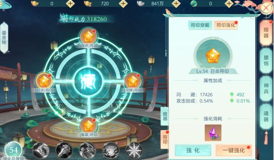 【玩法说明】玩家可通过收集符印,激活符印套装。符印套装可通过强化提升人物百分比基础属性和特殊属性。符印有4种,分为暗器符印、腰饰符印、神兵符印、魂器符印。
