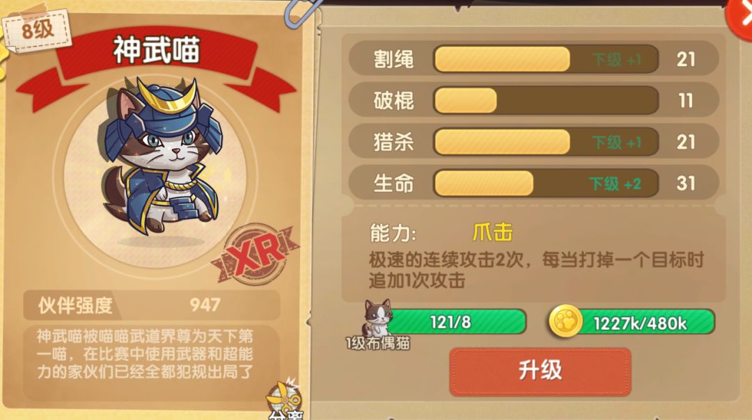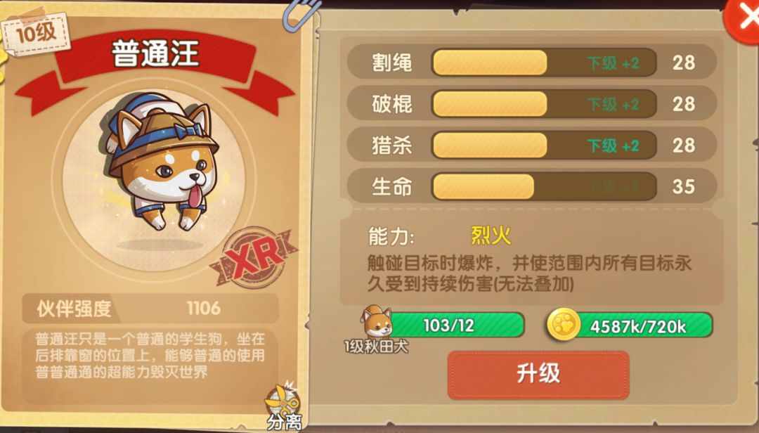 秋田犬可能是游戏中最全能的一只宠物了,割绳砸棍猎杀几乎无所不能,从它均衡的属性条便能看出,一只高级秋田犬可能是所有玩家都渴望的梦想了!